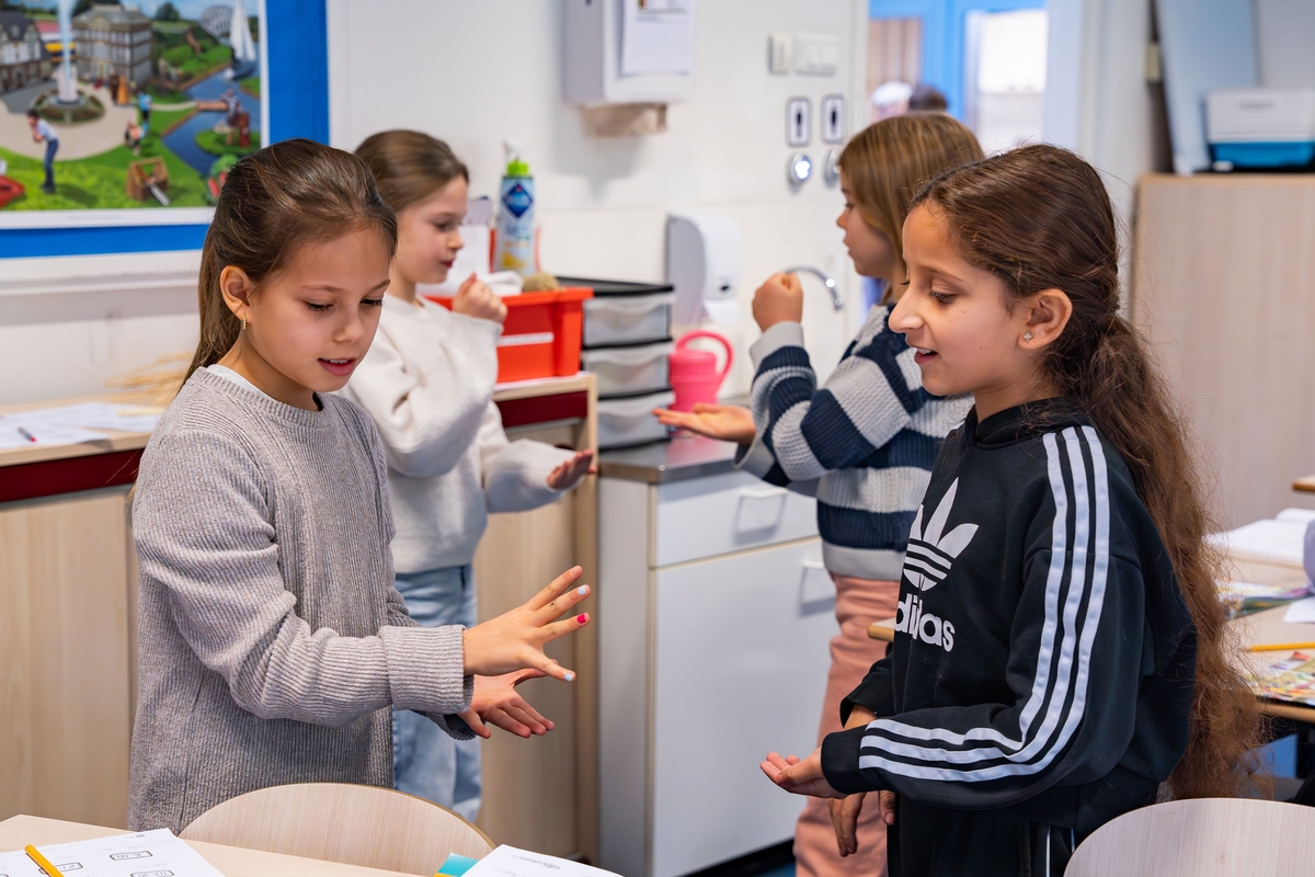 Leerlingen leren met elkaar, van elkaar en door elkaar. Dit doen ze door te praten, samen te werken en te bewegen.